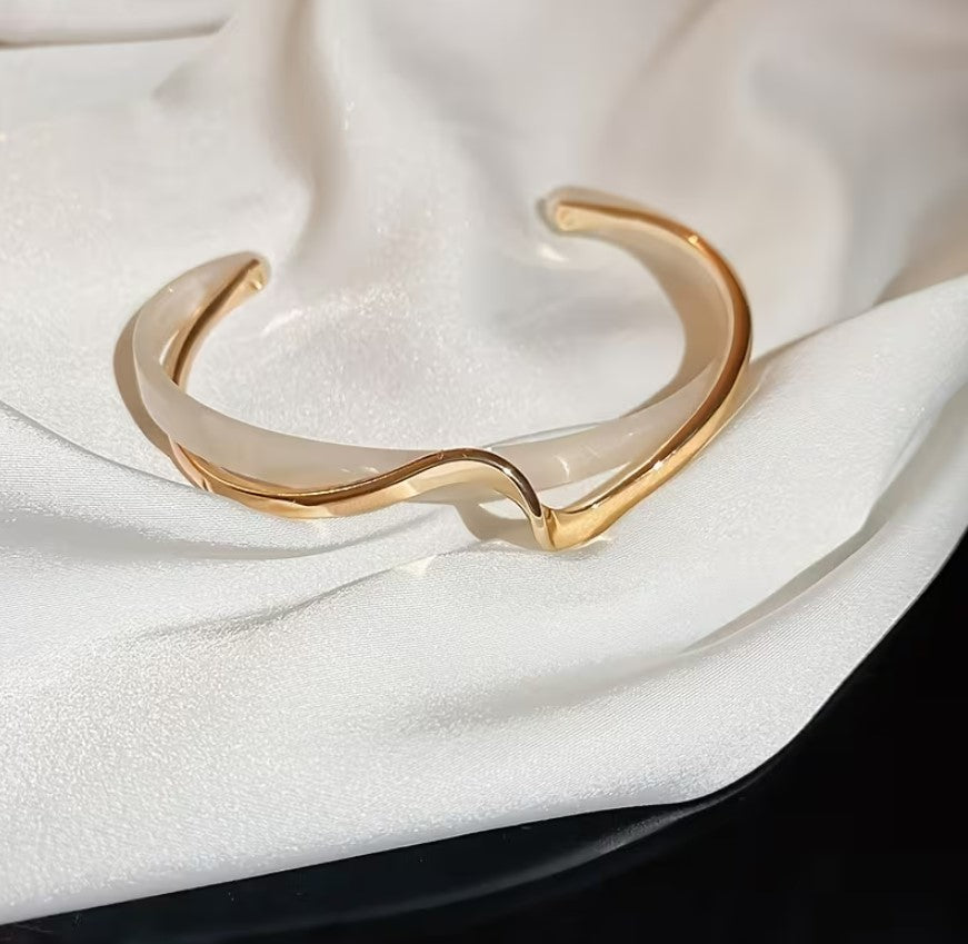 • Minimalist wave-shaped cuff bangle with a sleek silhouette.