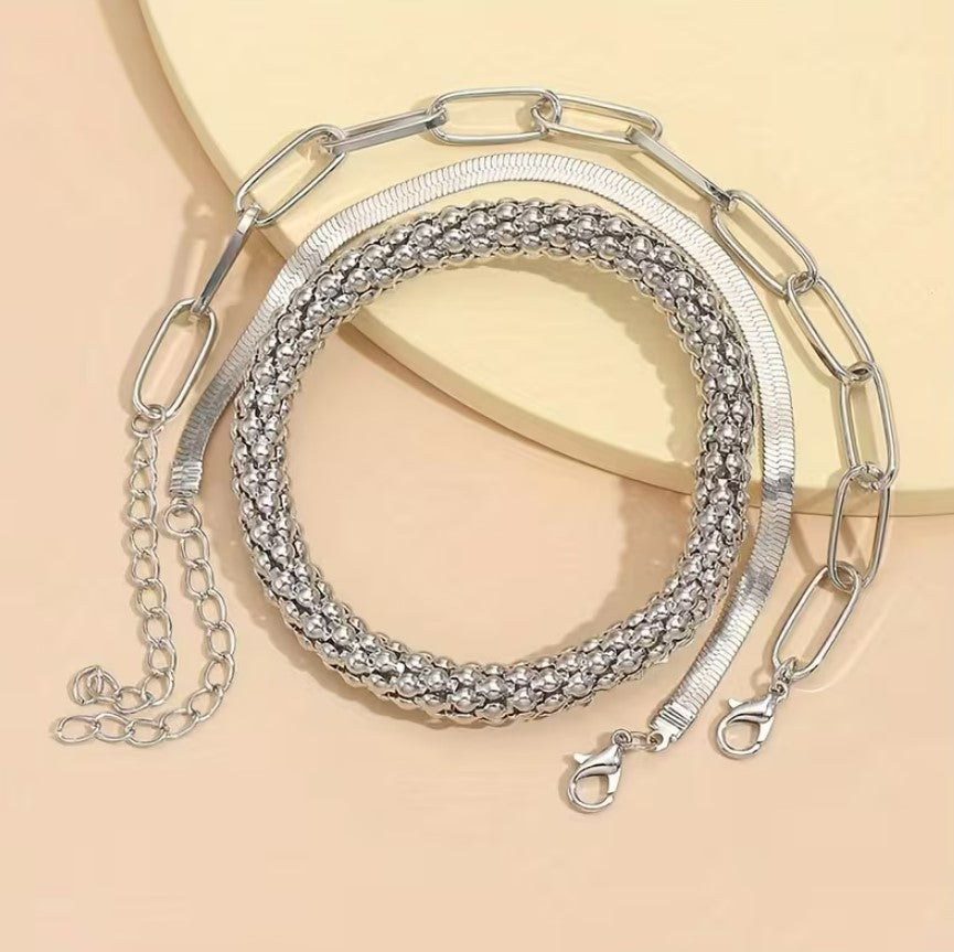 • 3-piece bracelet set with multi-layer snake bone chain design.