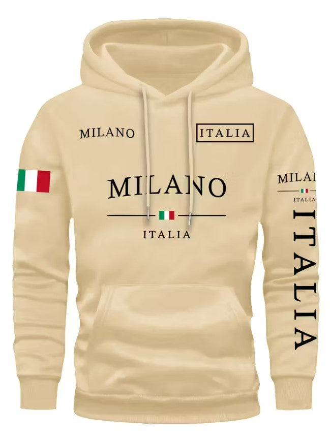The Rory hoodie captures bold European street style with a strong Italian identity. Featuring an Italian flag graphic combined with Milan lettering, this hooded sweatshirt blends modern fashion with cultural pride. Designed for comfort and everyday wear, it’s a standout piece for casual and urban looks.