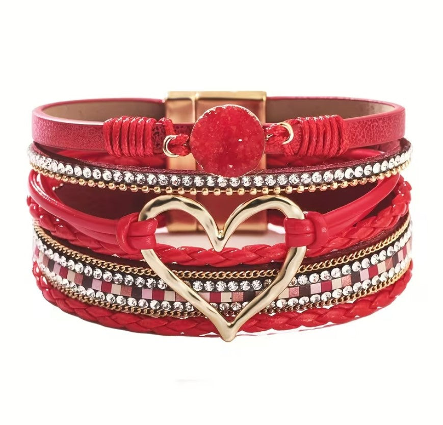 • Hand-woven multi-layer faux leather bracelet with a striking golden heart detail.