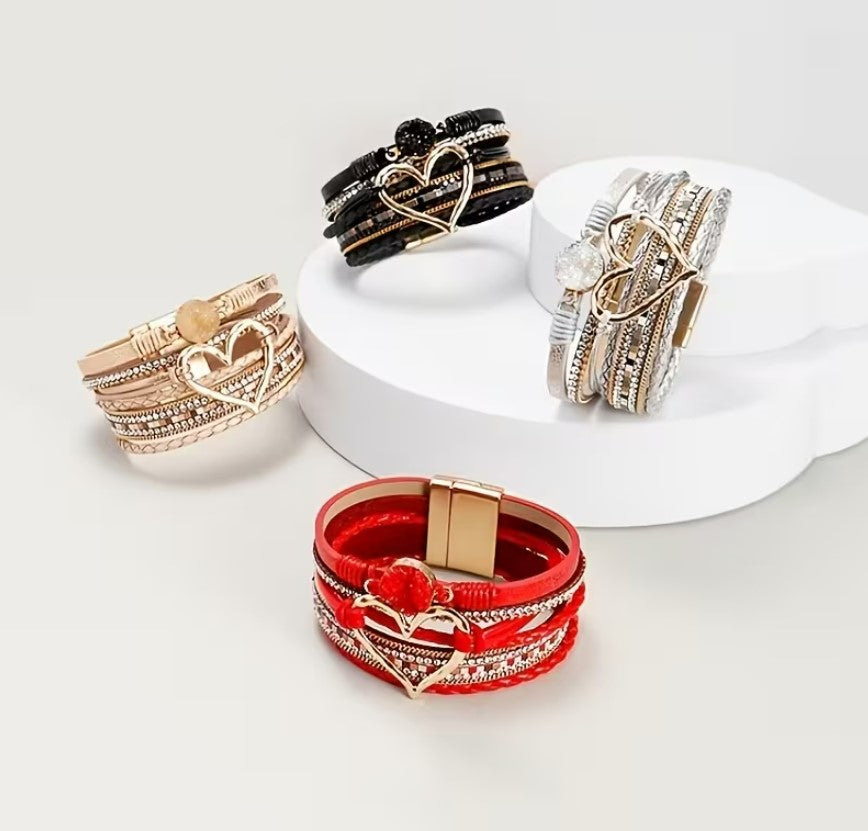 This bracelet elevates your look with a unique, free-spirited flair. Its layered design and prominent heart accent create a fashionable statement while remaining easy to wear and style with a variety of outfits.